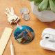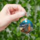 Renderização digital em 3D de uma bela e triste sereia sentada sobre uma pedra e um golfinho bonitinho sobre fundo oceânico de fantasia azul