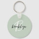 Esta elegante pulseira de chave personalizada apresenta um monograma e primeiro nome em script moderno preto e branco sobre um fundo verde sage.