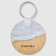 Um chaveiro com uma fotografia de uma praia marrom ouro arenosa com surf branco de espuma.