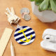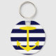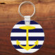 Uma silhueta amarela brilhante de uma âncora está sobre um fundo listrado branco e azul-marinho. Uma design náutica divertida.