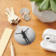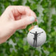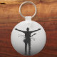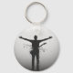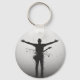 Este chaveiro circular de alumínio apresenta uma impressionante silhueta de músico em preto e branco com braços estendidos e um efeito único em estilo glitch.