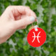 Símbolo de peixes em branco sobre fundo vermelho.