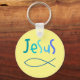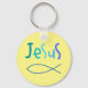 Um simples chaveiro de Jesus, mas há o símbolo do peixe e as palavras Jesus em tons de azul. Um belo presente para o cristão.