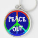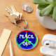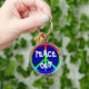 O chaveiro do símbolo da paz é um design colorido em um fundo azul. Para alterar o plano de fundo azul, clique em "Personalizar" e, em seguida, em "editar" e, em seguida, em "plano de fundo" para alterar a cor. "PEACE OUT" está em negrito texto azul no meio. Um símbolo retrógrado personalizado de paz e amor!