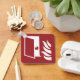 Porta de proteção contra incêndios e ícone de chama em fundo vermelho. Texto personalizado no verso.