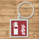 Extintor de incêndio e ícone de chama sobre fundo vermelho.