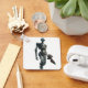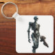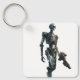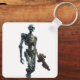 Um robô humanoide que é esqueleto como em uma cidade futurista arruinada enquanto se cuida de uma arma por píxeis.