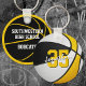 Este legal chaveiro do tema de basquete apresenta a imagem realista de uma bola de basquete que tem painéis coloridos em preto, branco e ouro alternados na frente e uma simples forma de basquete preto no verso - personalize facilmente com o nome do jogador & número de camisa na frente e na escola ou no nome do clube e nome do mascote no verso - por katz_d_zynes