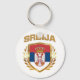 A bandeira nacional da Sérvia é infundida numa forma falsa de escudo dourado que, por si só, repousa sobre folhas falsas de ouro, o nome do país é acrescentado acima da imagem.