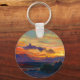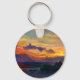 Um design de arte de um belo pôr do sol também mostrando rochas, praia e um homem pescando.