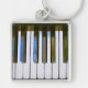 Estudo em Azul - O trabalho artístico original de ZoeSPEAK sobre este Keyring é um close-up de um teclado de piano, com um realce azul elétrico nas teclas escuras do piano, e reflexões das teclas na madeira marrom-escura no fundo. Uma fina linha de vermelho macio separa a madeira das teclas.