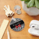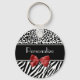 Um chaveiro de padrão robusto de animais preto e branco com faixas de zebra modernas no fundo e uma impressão na moda-leopardo no topo e embelezada com uma fita vermelha-menina amarrada num arco. Personalize o teclado de moda das mulheres chic adicionando seu nome. Imagem plana, não fita real.