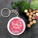 Botão redondo chaveiro apresenta texto divertido "Trabalhando Nove para Vinho" em uma mancha de vinho tinto. Chaveiros fazem presentes memoráveis para familiares e amigos ou criam por si mesmos.