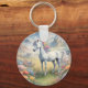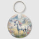 Um chaveiro mostrando uma imagem sonhadora de um unicórnio branco com um mane arco-íris em pé num campo de flores. Ao fundo estão montanhas majestosas. O presente perfeito para dar àqueles que amam unicórnios mágicos e místicos. Contém conteúdo generativo.