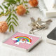 Uma ilustração de um unicórnio fofo com cabelo colorido e montagem rosa, e arco-íris com nuvens brancas. Este adorável design de conto de fadas kawaii é uma ideia de presente para amantes, amantes de os animais e amantes de filmes mágicos.