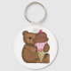Um adorável ursinho de pelúcia sentado e agarrado ao seu cone gigante de sorvete com uma colher de sorvete de chocolate e uma colher de morango.