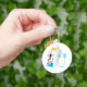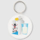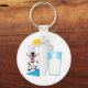 Um copo de leite ao lado de uma caixa de leite com uma imagem de vaca. Esta design parece realmente eficaz nesta Chaveiro