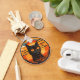 Este gato preto inspirado na safra. Com um incrível pano de fundo solar em tons de laranja vibrantes, esta ilustração estética é perfeita para amantes felinos e entusiastas únicos dos chaveiros.