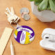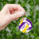 Este chaveiro de vôlei de meninos roxos, amarelos e brancos com o nome da equipe apresenta um vôlei tricolor sobre o qual você pode personalizar o nome do jogador e o número de camisa mais o nome da escola e do mascote - por katz_d_zynes