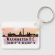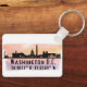 Chaveiro apresenta a silhueta de linha do horizonte da cidade de Washington DC com abertura de cor d'água e coordenadas de mapa de latitude e longitude