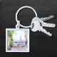 Watercolor Eiffel Tower Paris French Cafe Chaveiro apresenta uma área de assentos de café francês com aquarelas, com Paris e a Torre Eiffel em segundo plano. Criado pelo Evco Studio www.zazzle.com/store/evcostudio