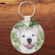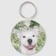 O pitbull branco aterrorizado com um grande sorriso feliz no rosto e flores silvestres no cordão-chave do cachorro-de-fundo