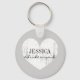 Chaveiros personalizadas de botões de coração preto e branco para madrinha. Design de tipografia de na moda elegante. Faça um para a tripulação de noivas; noivas, madrinha de casamento, florista, mãe da noiva, etc. Cor de fundo personalizável para corresponder à sua festa de casamento ou chá de panela. Correntes personalizadas com símbolo de amor climático e modelo de tipografia de tendências.