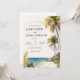 Este convite para o casamento mostra uma cena de praia em Florida Keys onde uma praia é cheia de palmeiras e verde local, uma bela cabana ao fundo e um dia ensolarado típico da Flórida.