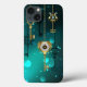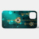 Chaves Douradas e antigas com engrenagens e marcadores penduram em correntes douradas sobre fundo verde luminoso.