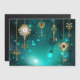 Chaves Douradas e antigas com engrenagens e marcadores penduram em correntes douradas sobre fundo verde luminoso.