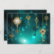 Chaves Douradas e antigas com engrenagens e marcadores penduram em correntes douradas sobre fundo verde luminoso.