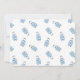 FRONT: Um plano desenhado à mão, montanhas, nuvens e estrelas sobre um plano de fundo azul gradiente. Adicione o nome do bebê à faixa ou uma frase como "É um menino!" Design em tons de azul e branco. O texto é cinza azulada escura. Volta: Um padrão de mala carregar em cores de coordenação. Um convite, porém sofisticado, para viajantes, candidatos a aventuras, pessoal de aviação ou chás de fraldas de avião!