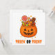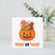 Envie saudações doces e assustadoras com esta placa lisa festiva com um balde alegre de abóbora cheio de doces coloridos e lábios. Perfeito para convites de festas, obrigado-você observa, ou mensagens sazonais, este design brincalhão adiciona um encantador toque de Halloween à sua correspondência. Ideal para festas infantis, eventos de truques ou de tratamento, ou comemorações do outono!