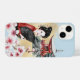 Uma linda garota gueixa segurando um fã fica em frente a um templo pagoda vermelho nesta capa de telefone única. Ela está vestida de vermelho e preto, com um fundo de ouro e azul pálido. No fundo estão os galhos cor-de-rosa. Bonito!
