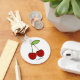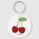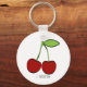 Um chaveiro construído com uma ilustração de cereja. Personalize-o com o seu próprio texto, cor de fundo, entre outras opções.