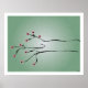 Uma bela imagem de cereja rosa floresce num galho de árvore contra um fundo verde num impressão. A foto é feita para parecer uma pintura.