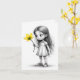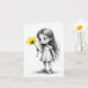 Um esboço de uma jovem com cabelo comprido segurando uma flor amarela enquanto a olha com uma maravilha de olhos largos.