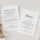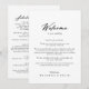 Esta carta elegante de boas-vindas de caligrafia é perfeita para um casamento rústico. O design simples e elegante apresenta a tipografia de scripts clássicos e ricos em preto e branco. Personalize a frente com uma mensagem de boas-vindas para seus convidados e seus nomes. Personalize as costas com a programação de eventos e outras informações úteis.