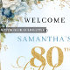 Celebrate a remarkable milestone with this elegant 80th birthday welcome sign featuring watercolor dusty blue and white flowers, soft eucalyptus greenery, and a shimmering gold frame. Designed in chic boho style with graceful script lettering, this floral welcome poster creates a stunning entrance display. Perfect for classy, garden, or luxury 80th birthday celebrations and unforgettable party décor.