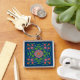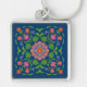 Um Chaveiro prateado, de cor prateada, com um Padrão Floral de Rangoli colorido em um Fundo Azul Profundo que você pode mudar se quiser. Parte da coleção Posh & Painterly 'Rangoli', este padrão pode ser ajustado para ajustado qualquer Chaveiro.