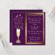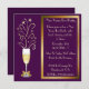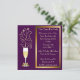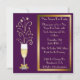convites de festas roxos e Vésperas de ano novo dourados. Gráficos de um copo de champanhe, com um arco de tom de ouro no caule e faíscas a disparar para fora do topo do vidro, contra um fundo roxo. Uma caixa de texto com moldura de tom dourado no lado direito do convite tem um texto amarelo pálido personalizável. Personalize para dizer o que quiser. Excelente procurando um convite para uma noite memorável.