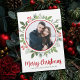 Este lindo verde-oliva com a coroa vermelha de Natal, rodeia sua dentro de fotos de Natal de um círculo. Um cartão magnético de férias para um casal ou família modernos. Folhas botânicas primavera do belo ímã fotográfico.