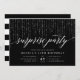 Nossos convites de festas de surpresa festivos em preto-e-branco chic apresentam cordas verticais de luzes brancas brilhantes através do topo, e "festa surpresa" na tipografia de gráficos de caligrafia. Personalize com seus detalhes surpreendentes de comemoração em branco; pode ser usado em qualquer ocasião, como festas de aniversário ou festas de aniversário. Um design chic em preto clássico e branco para eventos elegantes.