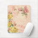Design romântico e nostálgico com texto da publicidade francesa, rosas herbáceas em amarelo e rosa e gravados floresce sobre um fundo rosado rosado e suavemente envelhecido.