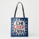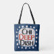 Um design de mensagem tipográfica divertido e fofo que diz "Chi Deep Dish". Ele tem texto preto e vermelho em um retângulo branco com pontos brancos engraçados e brincalhões ao seu redor, tudo em um fundo azul.