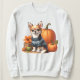 Adorável Chihuahua sentada entre vibrantes decorações de outono, com abóboras e flores de laranja sazonais, vestida calorosamente em um suéter elegante, perfeito para temas de outono ou conceitos sazonais aconchegantes.
