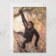Um chimpanzé bonito está pendurado por um braço numa árvore. Ele tem um olhar sério, mas malicioso no rosto. A árvore e a selva formam um fundo sutil em cores naturais, incluindo castanhos, verdes, dourados, laranjas, entre outros. Amantes de os animais, especialmente fãs de chimpanzés, vão adorar essa arte retrô animal detalhada e realista.