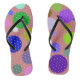 Chinelos com pontos e mais pontos em um fundo rosa.