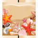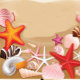 Um arranjo vibrante de conchas e estrelas-do-mar em uma praia arenosa.