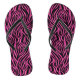 Chinelos pretos com um padrão de listras de zebra rosa-quente e pretas, são perfeitos para vestir sua roupa para qualquer ocasião.